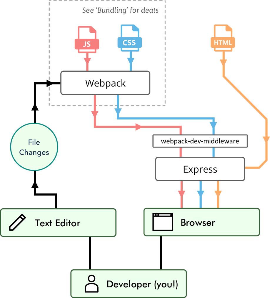 then packages all of those modules into a small number of bundles - often only one - to be loaded by the browser.